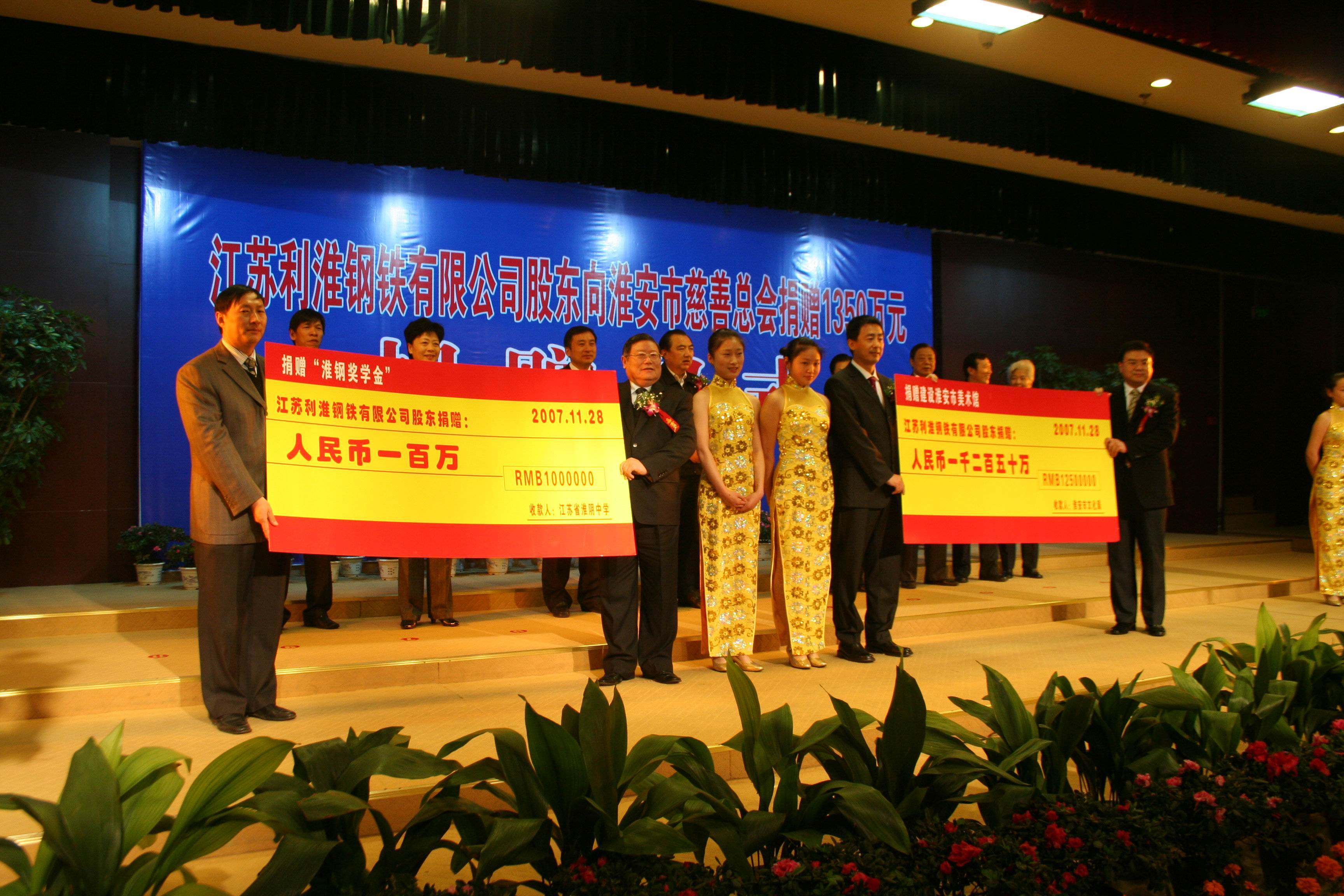2002年,沙鋼淮鋼特鋼公司在淮陰區(qū)五里小學(xué)成立“淮鋼春蕾班”,每年資助1.5萬元;2007年向淮安市慈善總會(huì)捐贈(zèng)1350萬元,其中1250萬元由市慈善總會(huì)定向捐贈(zèng)淮安市利淮“美術(shù)館”,另100萬元贈(zèng)給江蘇省淮陰中學(xué)作為“淮鋼獎(jiǎng)學(xué)金”;向淮安團(tuán)市委希望辦捐款以及向淮安盱眙穆店 鄉(xiāng)中心小學(xué)捐贈(zèng)“愛心禮盒”等捐款累計(jì)112萬元。